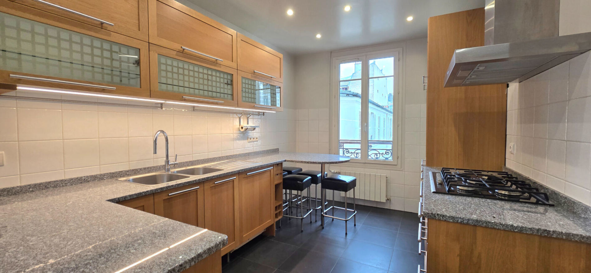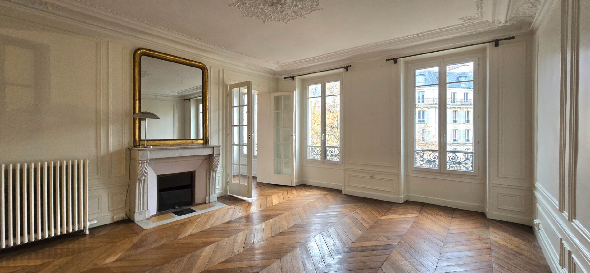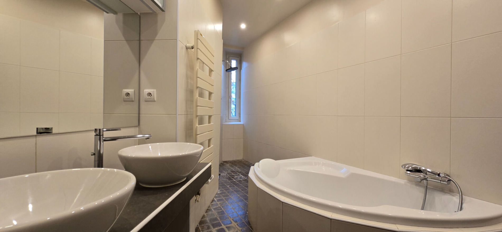 Au sein d'un immeuble ancien sécurisé, avec digicode et interphone, et gardiens, au troisième étage par ascenseur, un appartement traversant de 120m². Il dispose d'une entrée avec rangements et bureau, une pièce de séjour, une salle à manger, une cuisine indépendante équipée, deux chambres principales, une salle de bains avec water-closet, une salle de douche avec water-closet. Chauffage individuel au gaz. Une cave en sous-sol. DPE:E Libre de suite Honoraires bail alur: 15 eurosTTC/m² Honoraires bail code civil: 15% du loyer annuel