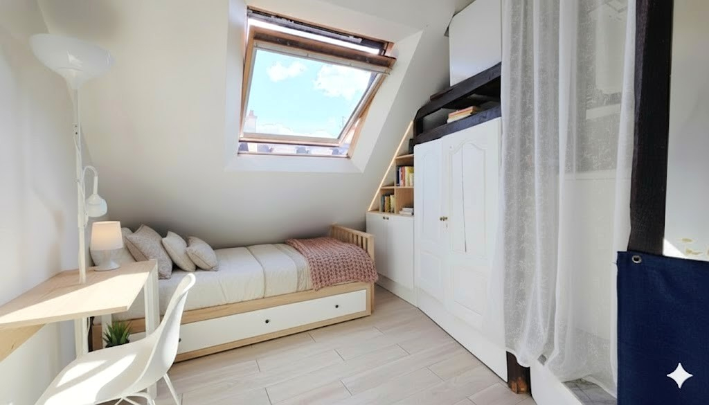 Au calme et avec vue dégagée sur le ciel parisien, cette chambre avec charpente apparente propose un espace nuit, un placard, un évier, ainsi qu'une baignoire sabot. Jouissance d'un wc sur le palier. Chauffage et eau chaude individuels électriques.